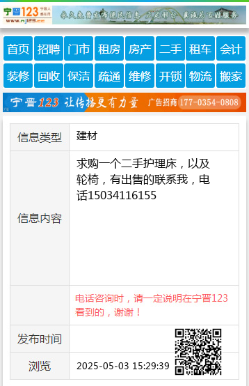 求购一个二手护理床,以及轮椅,有出售的联系我,电话15034116155