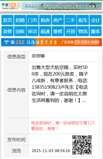 出售大型犬航空箱,买时500多,现在200元就卖,箱子八成新,有意者联系,电话:13835190823卢先生 【电话咨询时,请一定说明在太原生活网看到的,谢谢!】 |