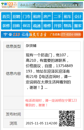 现有一个防盗门,宽107,高210,有需要的速联系,价格面议,自提,13754849193,地址在迎泽区迎泽南街21号 【电话咨询时,请一定说明在太原生活网看到的,谢谢!】 |