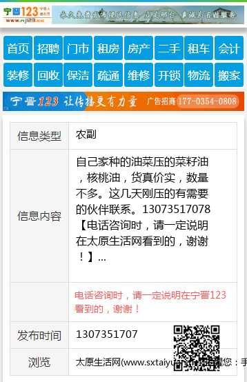 自己家种的油菜压的菜籽油,核桃油,货真价实,数量不多。这几天刚压的有需要的伙伴联系。13073517078 【电话咨询时,请一定说明在太原生活网看到的,谢谢!】 |