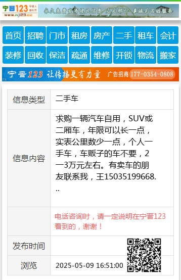 求购一辆汽车自用,SUV或二厢车,年限可以长一点,实表公里数少一点,个人一手车,车贩子的车不要,2一3万元左右。有卖车的朋友联系我,王15035199668 【电话咨询时,请一定说明在太原生活网看到的,谢谢!】 |