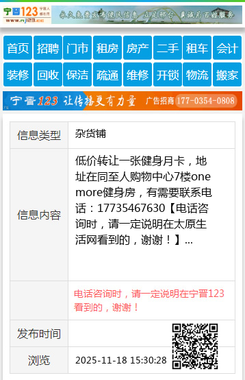 低价转让一张健身月卡,地址在同至人购物中心7楼onemore健身房,有需要联系电话:17735467630 【电话咨询时,请一定说明在太原生活网看到的,谢谢!】 |