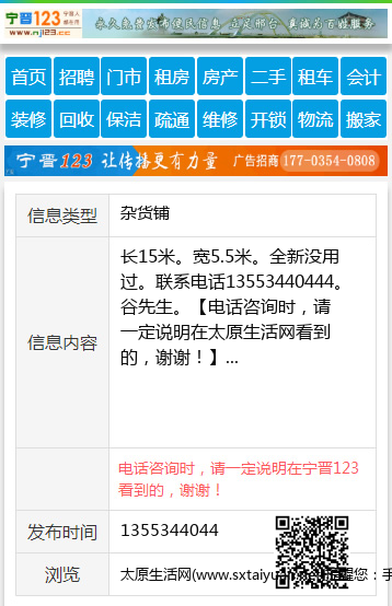 长15米。宽5.5米。全新没用过。联系电话13553440444。谷先生。 【电话咨询时,请一定说明在太原生活网看到的,谢谢!】 |