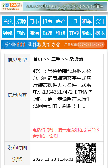 转让:景德镇陶瓷落地大花瓶书画箭筒雕刻文字中式客厅装饰摆件大号摆件,联系电话13643517472 【电话咨询时,请一定说明在太原生活网看到的,谢谢!】 |