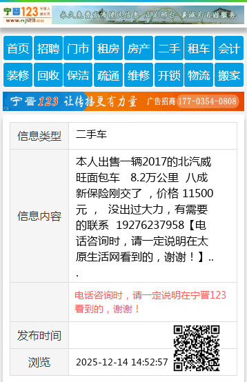 本人出售一辆2017的北汽威旺面包车 8.2万公里 八成新保险刚交了 ,价格 11500元 , 没出过大力,有需要的联系 19276237958 【电话咨询时,请一定说明在太原生活网看到的,谢谢!】 |