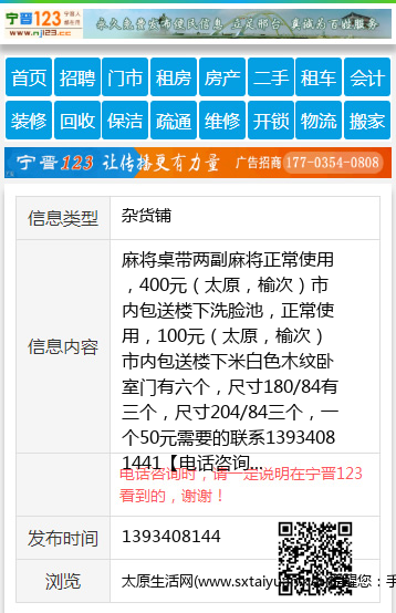麻将桌带两副麻将正常使用,400元(太原,榆次)市内包送楼下 洗脸池,正常使用,100元(太原,榆次)市内包送楼下 米白色木纹卧室门有六个,尺寸180/84有三个,尺寸204/84三个,一个50元 需要的联系13934081441