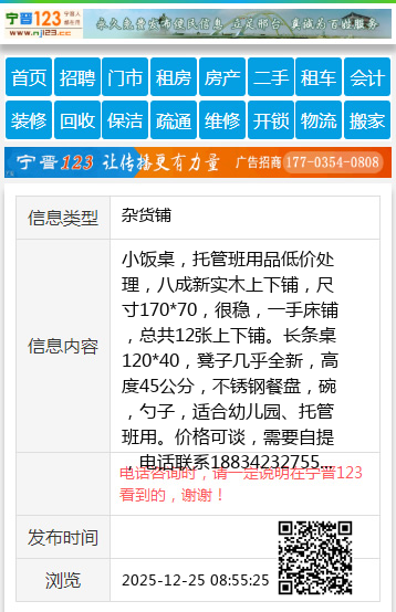小饭桌,托管班用品低价处理,八成新实木上下铺,尺寸170*70,很稳,一手床铺,总共12张上下铺。长条桌120*40,凳子几乎全新,高度45公分,不锈钢餐盘,碗,勺子,适合幼儿园、托管班用。价格可谈,需要自提,电话联系18834232755 【电话咨询时,请一定说明在太原生活网看到的,谢谢!】 |