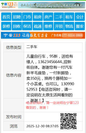 儿童自行车,95新,送给有缘人,13623456644.,迎新街自体。谢谢您有一付汽车新羊毛座垫,一付新脚垫,卖350元,换两个藤椅加一个小茶桌。也可以。13099052953 【电话咨询时,请一定说明在太原生活网看到的,谢谢!】 |