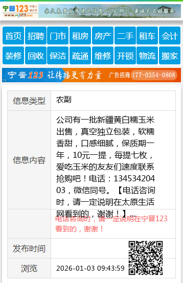 公司有一批新疆黄白糯玉米出售,真空独立包装,软糯香甜,口感细腻,保质期一年,10元一提,每提七枚,爱吃玉米的友友们速度联系抢购吧!电话:13453420403,微信同号。 【电话咨询时,请一定说明在太原生活网看到的,谢谢!】 |
