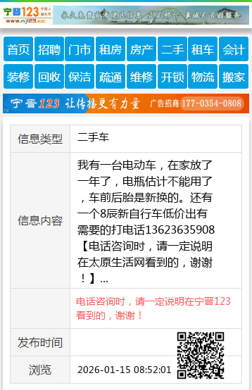 我有一台电动车,在家放了一年了,电瓶估计不能用了,车前后胎是新换的。还有一个8辰新自行车低价出有需要的打电话13623635908 【电话咨询时,请一定说明在太原生活网看到的,谢谢!】 |