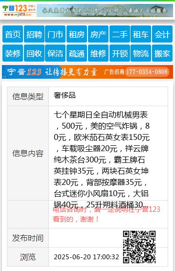 七个星期日全自动机械男表,500元,美的空气炸锅,80元,欧米茄石英女表150元,车载吸尘器20元,祥云牌纯木茶台300元,霸王牌石英挂钟35元,两块石英女坤表20元,背部按摩器35元,台式迷你小风扇10元,大铝锅40元,25升朔料酒桶30元,托布带杆10元,大装米桶35元,13111006679,微信同号 【电话咨询时,请一定说明在太原生活网看到的,谢谢!】 |