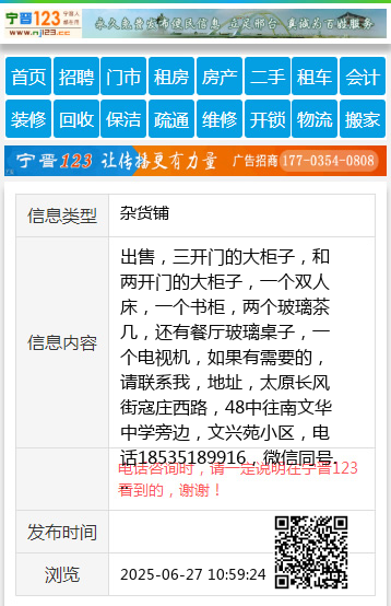 出售,三开门的大柜子,和两开门的大柜子,一个双人床,一个书柜,两个玻璃茶几,还有餐厅玻璃桌子,一个电视机,如果有需要的,请联系我,地址,太原长风街寇庄西路,48中往南文华中学旁边,文兴苑小区,电话18535189916,微信同号 【电话咨询时,请一定说明在太原生活网看到的,谢谢!】 |