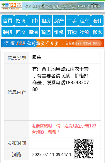 有适合工地用警式雨衣十套,有需要者请联系,价格好商量,联系电话18834830780 【电话咨询时,请一定说明在太原生活网看到的,谢谢!】 |