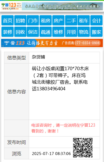 转让小饭桌闲置170*70木床(2套)可带褥子。床在坞城北街橡胶厂宿舍。联系电话13803496404 【电话咨询时,请一定说明在太原生活网看到的,谢谢!】 |