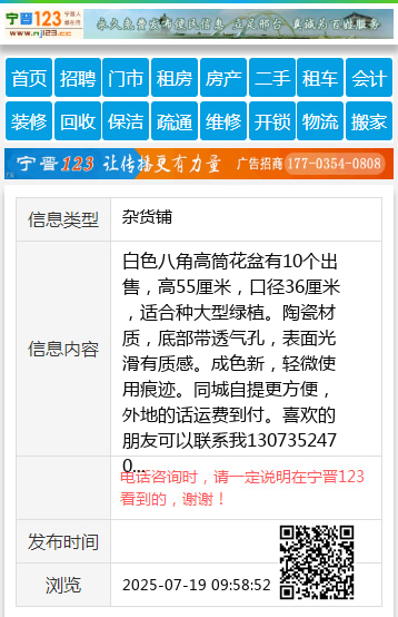 白色八角高筒花盆有10个出售,高55厘米,口径36厘米,适合种大型绿植。陶瓷材质,底部带透气孔,表面光滑有质感。成色新,轻微使用痕迹。同城自提更方便,外地的话运费到付。喜欢的朋友可以联系我1307352470