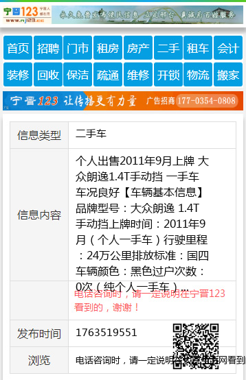 个人出售2011年9月上牌 大众朗逸1.4T手动挡 一手车 车况良好 【车辆基本信息】品牌型号:大众朗逸 1.4T 手动挡上牌时间:2011年9月(个人一手车)行驶里程:24万公里排放标准:国四车辆颜色:黑色过户次数:0次(纯个人一手车) 【车况描述】 发动机变速箱:1.4T涡轮增压发动机,动力充沛,手动挡换挡顺畅,无顿挫、无漏油。 车身结构:无重大事故、无火烧、无水泡,车身骨架完好。 内饰情况:内饰整洁,座椅、有磨损,功能按键正常。轮胎/电瓶:轮胎磨损正常,电瓶状态良好(电瓶去年冬天更换)。 【配置亮点】 标配ABS+EBD、电动门窗、中控锁、天窗、DVD、真皮座椅 【价格】 售价:0.65万元可小议价,欢迎看车试驾,非诚勿扰! 【联系方式】 电话:17635195519 看车地点:太原市