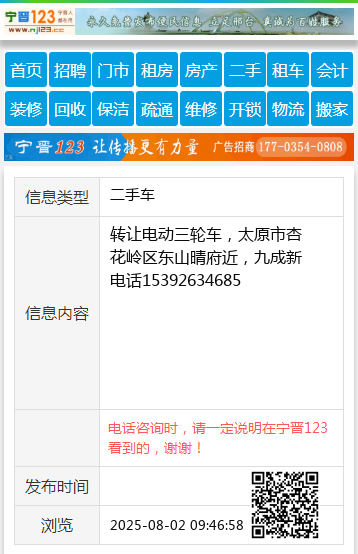免责声明:本栏目信息由网友自行发布,太原生活网不承担任何责任!提高警惕,谨防诈骗!做推广、做信息置顶!请加太原生活网客服微信:taiyuanwangzhan
