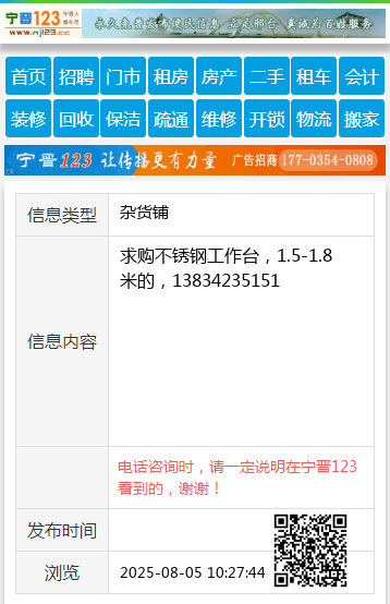 求购不锈钢工作台,1.5-1.8米的,13834235151