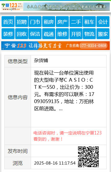 现在转让一台单位演出使用的大型电子琴C A S I O : C T K一550,出让价为:300元。有需求的可以联系:17093059135,地址:万拍林区前进路。