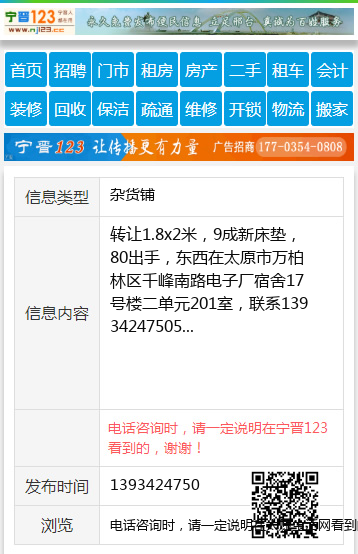 转让1.8x2米,9成新床垫,80出手,东西在太原市万柏林区千峰南路电子厂宿舍17号楼二单元201室,联系13934247505 【电话咨询时,请一定说明在太原生活网看到的,谢谢!】 |