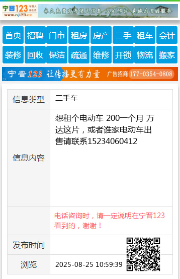 想租个电动车 200一个月 万达这片,或者谁家电动车出售请联系15234060412 【电话咨询时,请一定说明在太原生活网看到的,谢谢!】 |