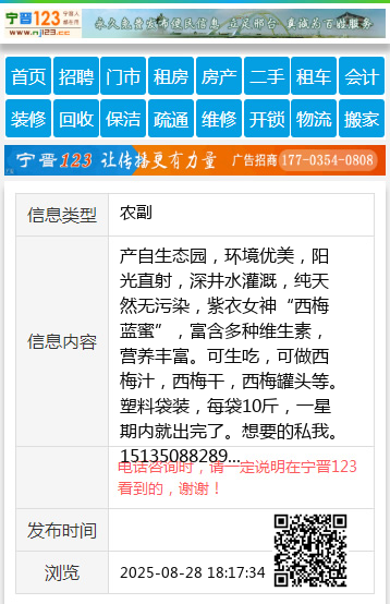 产自生态园,环境优美,阳光直射,深井水灌溉,纯天然无污染,紫衣女神“西梅蓝蜜”,富含多种维生素,营养丰富。可生吃,可做西梅汁,西梅干,西梅罐头等。塑料袋装,每袋10斤,一星期内就出完了。想要的私我。15135088289 【电话咨询时,请一定说明在太原生活网看到的,谢谢!】 |