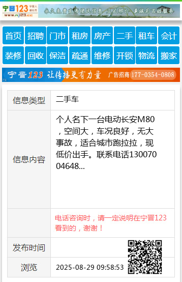 个人名下一台电动长安M80,空间大,车况良好,无大事故,适合城市跑拉拉,现低价出手。联系电话13007004648 【电话咨询时,请一定说明在太原生活网看到的,谢谢!】 |