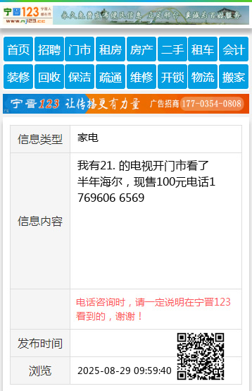 我有21. 的电视开门市看了半年海尔,现售100元电话1769606 6569
