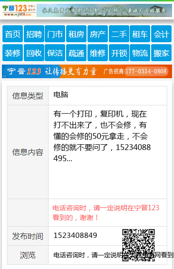 有一个打印,复印机,现在打不出来了,也不会修,有懂的会修的50元拿走,不会修的就不要问了,15234088495 【电话咨询时,请一定说明在太原生活网看到的,谢谢!】 |