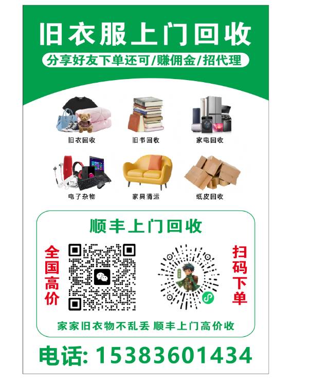 旧衣服????鞋子????包包???? 毛绒玩具????床单被罩????️ 书本????家具????️家电???? 全国顺丰免费上门回收换???? 直接打款结算到账微信 小程序一键????预约下单 0 元就可做代理 有想法的联系我 15383601434