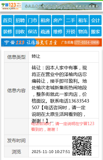 转让:因本人家中有事,现将正在营业中的泽榆肉店忍痛转让,接手即可盈利。地处榆次老城新集街热闹地段,整条街就此一家肉店,价格面议。联系电话13633543507 【电话咨询时,请一定说明在太原生活网看到的,谢谢!】 |