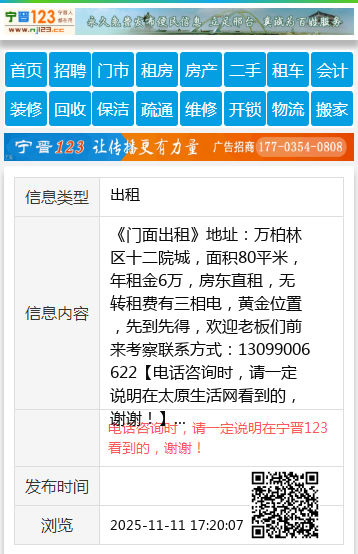 《门面出租》地址:万柏林区十二院城,面积80平米,年租金6万,房东直租,无转租费