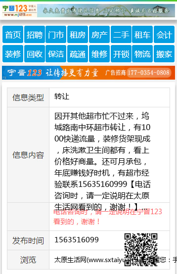 因开其他超市忙不过来,坞城路南中环超市转让,有1000快递流量,装修货架现成,床洗漱卫生间都有,看上价格好商量。还可月承包,年底赚钱好时机,有超市经验联系15635160999
