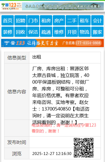 厂房、库房出租:晋源区邻太原古县城,独立院落,4000平保温板钢结构,可做厂房、库房,可整租可分租,年底价格优惠。有意者欢迎来电咨询、实地考察。赵女士:13700540850 【电话咨询时,请一定说明在太原生活网看到的,谢谢!】 |