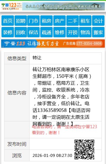 转让万柏林区南寒康乐小区生鲜超市,150平米(底商),带烟证,格局方正,卫生间,监控、收银系统,冷冻,冷柜设备齐全,多年老店,接手营业,低价转让。电话13363589058 【电话咨询时,请一定说明在太原生活网看到的,谢谢!】 |