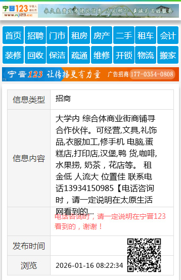 大学内 综合体商业街商铺寻合作伙伴。可经营,文具,礼饰品,衣服加工,修手机 电脑,蛋糕店,打印店,汉堡,鸭 货,咖啡,水果捞, 奶茶,花店等。 租金低 人流大 位置佳 联系电话13934150985 【电话咨询时,请一定说明在太原生活网看到的,谢谢!】 |