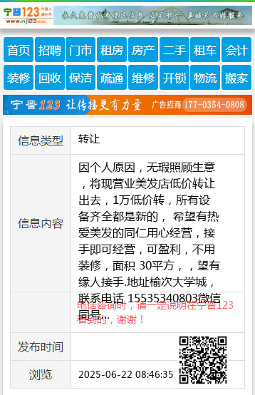 因个人原因,无瑕照顾生意,将现营业美发店低价转让出去,1万低价转,所有设备齐全都是新的, 希望有热爱美发的同仁用心经营,接手即可经营,可盈利,不用装修,面积 30平方,,望有缘人接手.地址榆次大学城,联系电话 15535340803微信同号 【电话咨询时,请一定说明在太原生活网看到的,谢谢!】 |