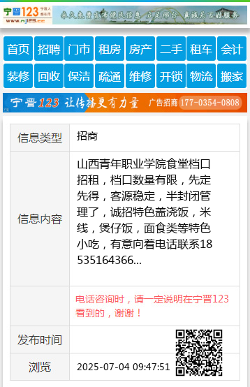 山西青年职业学院食堂档口招租,档口数量有限,先定先得,客源稳定,半封闭管理了,诚招特色盖浇饭,米线,煲仔饭,面食类等特色小吃,有意向着电话联系18535164366 【电话咨询时,请一定说明在太原生活网看到的,谢谢!】 |