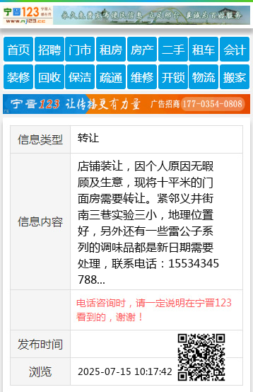 店铺装让,因个人原因无暇顾及生意,现将十平米的门面房需要转让。紧邻义井街南三巷实验三小,地理位置好,另外还有一些雷公子系列的调味品都是新日期需要处理,联系电话:15534345788 【电话咨询时,请一定说明在太原生活网看到的,谢谢!】 |