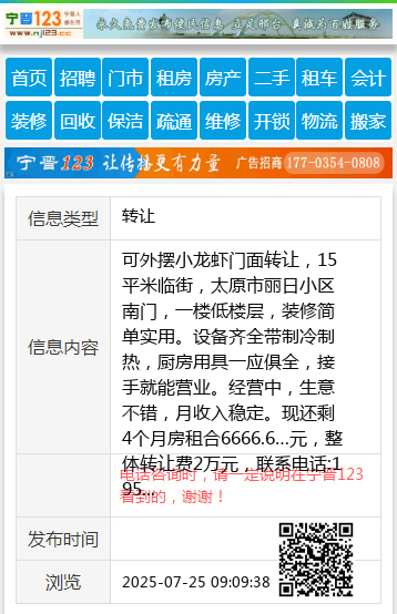 可外摆小龙虾门面转让,15平米临街,太原市丽日小区南门, 一楼低楼层,装修简单实用。设备齐全带制冷制热,厨房用具一应俱全,接手就能营业。 经营中,生意不错,月收入稳定。现还剩4个月房租合6666.6…元,整体转让费2万元, 联系电话:19524488943