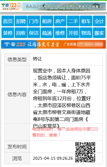 现营业中,因本人身体原因,饭店急须转让,面积75平米,水,电,暖,上下水齐全门面房,一年房租7万,房租到年底12月份,位置好,太原市迎泽区柳巷区山西省太原市柳巷文庙街道地藏奄8号东起第二间门面房《巴山家常菜》 【电话咨询时,请一定说明在太原生活网看到的,谢谢!】 |