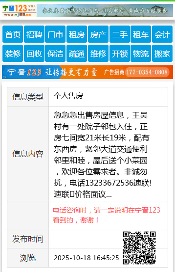 急急急出售房屋信息,王吴村有一处院子邻包入住,正房七间宽21米长19米,配有东西房,紧邻大道交通便利邻里和睦,屋后送个小菜园,欢迎各位需求者。非诚勿扰,电话13233672536速联!速联❗价格面议