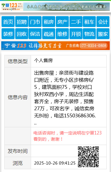出售房屋;亲贤街与建设路口附近,无专小区步梯房6/5,建筑面积75,学校对口狄村双西小学,周边生活配套齐全,房子无装修,预售27万,可改名字,诚信卖房无纠纷,电话15503686306 【电话咨询时,请一定说明在太原生活网看到的,谢谢!】 |