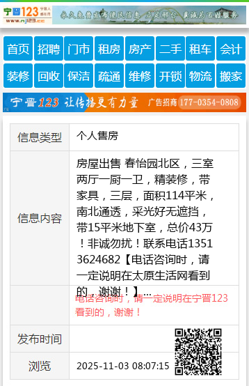 房屋出售 春怡园北区,三室两厅一厨一卫,精装修,带家具,三层,面积114平米,南北通透,采光好无遮挡,带15平米地下室,总价43万!非诚勿扰!联系电话13513624682 【电话咨询时,请一定说明在太原生活网看到的,谢谢!】 |
