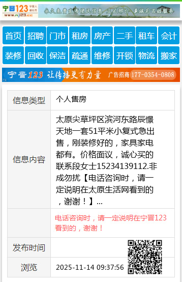 太原尖草坪区滨河东路辰憬天地一套51平米小复式急出售,刚装修好的,家具家电都有。价格面议,诚心买的联系段女士15234139112.非成勿扰 【电话咨询时,请一定说明在太原生活网看到的,谢谢!】 |