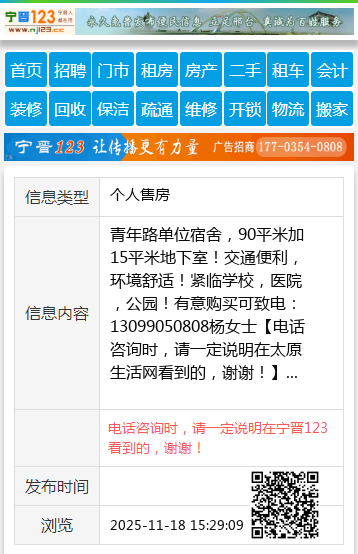 青年路单位宿舍,90平米加15平米地下室!交通便利,环境舒适!紧临学校,医院,公园!有意购买可致电:13099050808杨女士 【电话咨询时,请一定说明在太原生活网看到的,谢谢!】 |