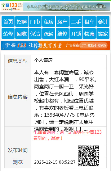 本人有一套闲置房屋,诚心出售,大红本满二,90平米。两室两厅一厨一卫,采光好,位置在长风西街,周围学校超市都有,地理位置优越,有喜欢的老板看上电话联系:13934047775 【电话咨询时,请一定说明在太原生活网看到的,谢谢!】 |