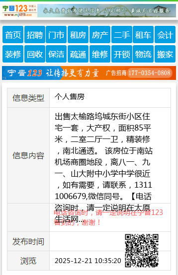 出售太榆路坞城东街小区住宅一套,大产权,面积85平米,二室二厅一卫,精装修,南北通透。 该房位于南站机场商圈地段,离八一、九一、山大附中小学中学很近 ,如有需要,请联系,13111006679,微信同号。 【电话咨询时,请一定说明在太原生活网看到的,谢谢!】 |