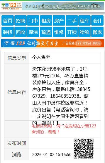 汾东花园98平米房子,2号楼2单元2104。45万直售精装修拎包入住,家具齐全,房东直售,联系电话13834567329、18646851938。离山大附中汾东校区非常近!底价出售 【电话咨询时,请一定说明在太原生活网看到的,谢谢!】 |