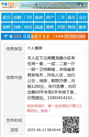 本人在下元商圈龙腾小区有住房一套,一层,二室一厅一厨一卫纯朝南,水电暖家具家电齐,拎包入住,出行公交,地铁,购物方便,月租1200元,年付优惠,也可出售69平米带6平米地下室,价格面议。15003414142 【电话咨询时,请一定说明在太原生活网看到的,谢谢!】 |
